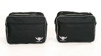 APAIR OF LINER BAGS TO BE USED WITH HONDA VFR 1200X CROSS TOURER EXPANDABLE FEATURES: •TOUGH WATER RESISTANT TEXTILE MATERIAL. •STRONG STITCHING. •ROBUST ZIPS. • ADJUSTABLE STRAP FOR SHOULDER CARRYING. • DESIGNED TO FIT THE INSIDE OF HARD PANNIERS AND CAN BE INSTANTLY REMOVED TO CARRY TO YOUR HOMEWORK OR HOTEL ROOM. • ONE INNER DOCUMENT POCKET AND ONE OUTER ZIPPED POCKET FOR PUTTING MAPS, PASSPORTS ETC. •STRONG BASE LINING AND STUDS USED TO KEEP THEM CLEAN TO KEEP ON THE GROUND. •PIPING MADE OF VERY STRONG MATERIAL ALONG THE OUTER LINING TO KEEP THEM IN SHAPE. • THESE BAGS CAN BE FLAT PACKED FOR EASY STORAGE. • BOTH THE BAGS ARE INDIVIDUALLY CRAFTED BY EXPERIENCED CRAFTSMEN. •OFFERED AT A VERY LOW PRICE AS COMPARED TO THE ORIGINAL LINERS. • EACH BAG WEIGHS APPROXIMATELY 550 GRAMS.